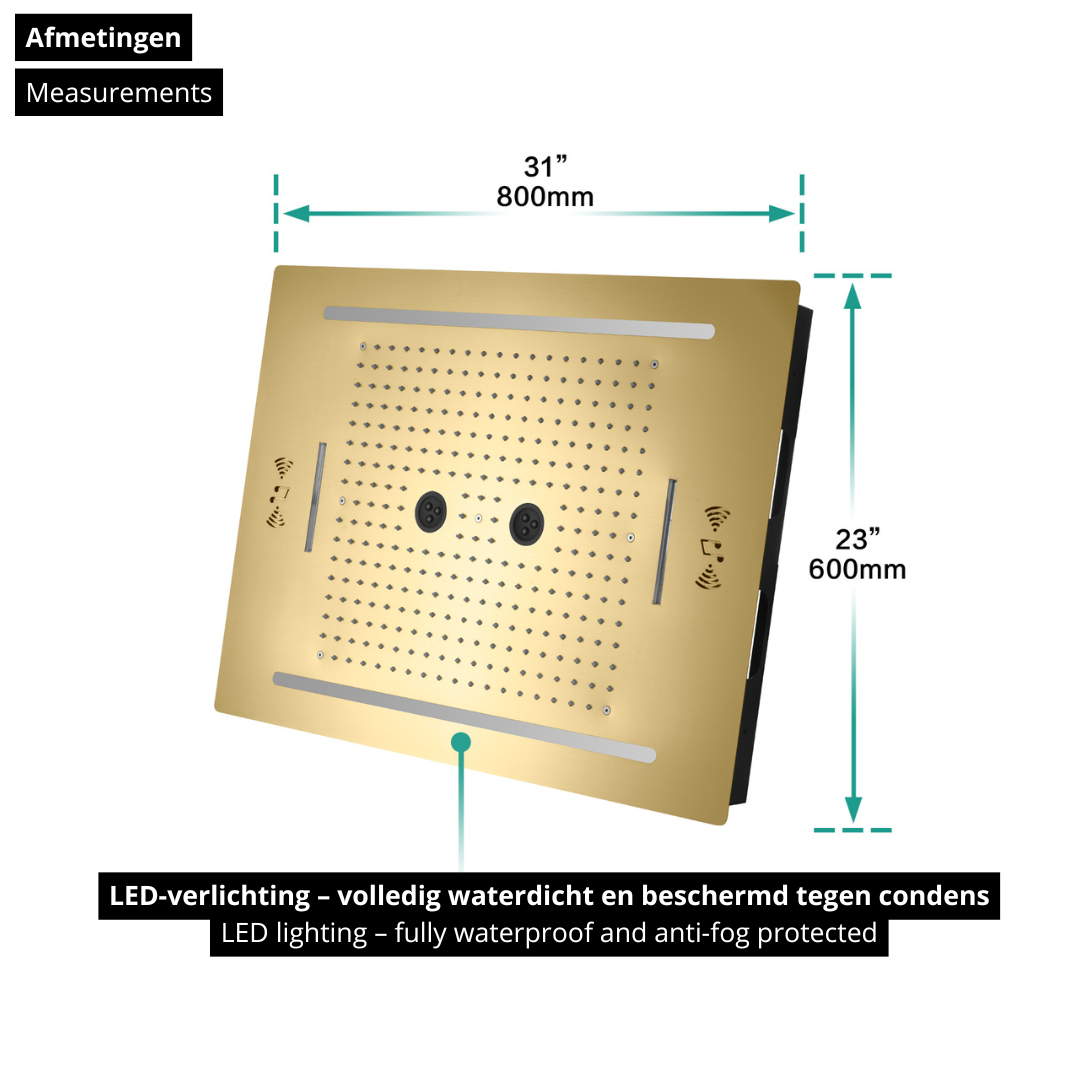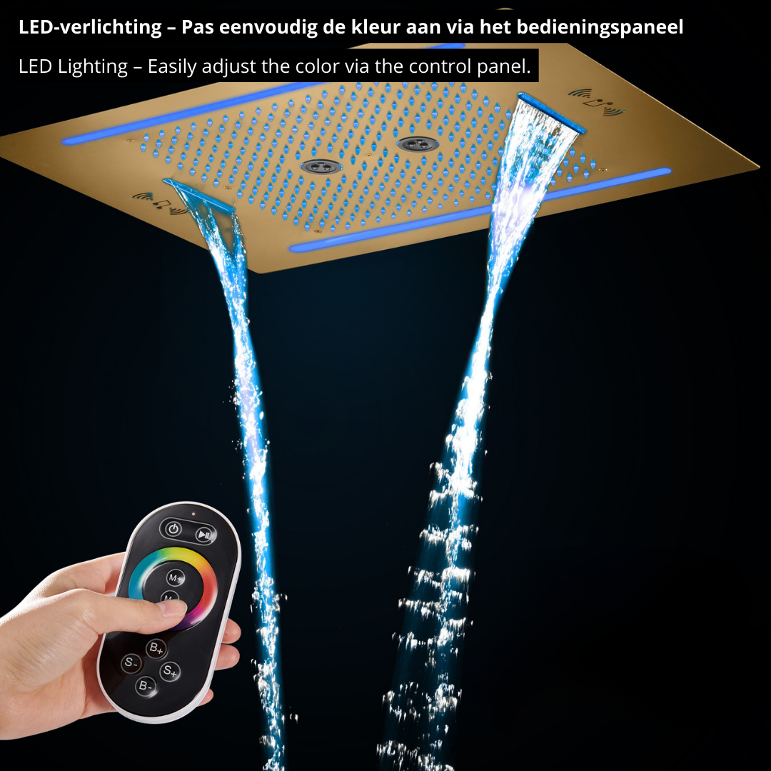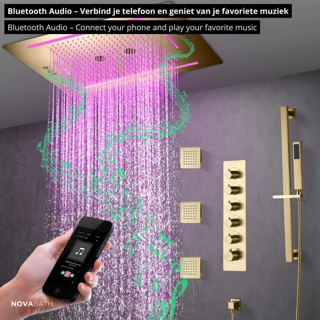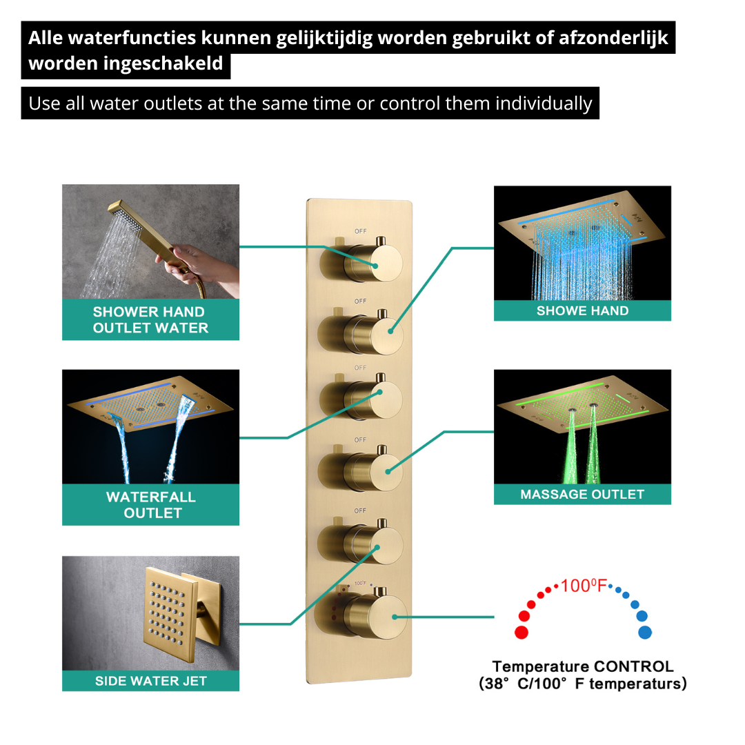 5-in-1 Thermostatische Inbouw Regendoucheset Valerie – Bluetooth & Speakers – LED Verlichting – Massagejets - Brushed gold
