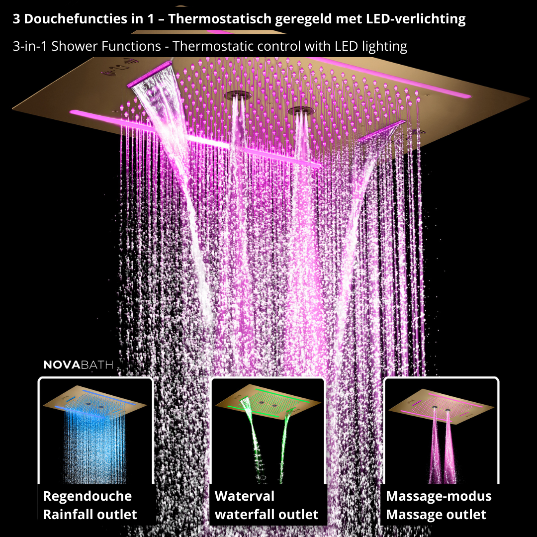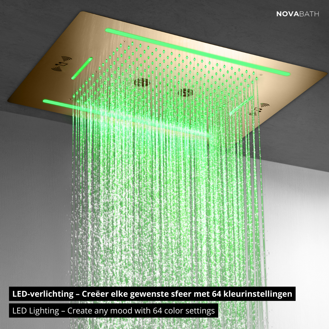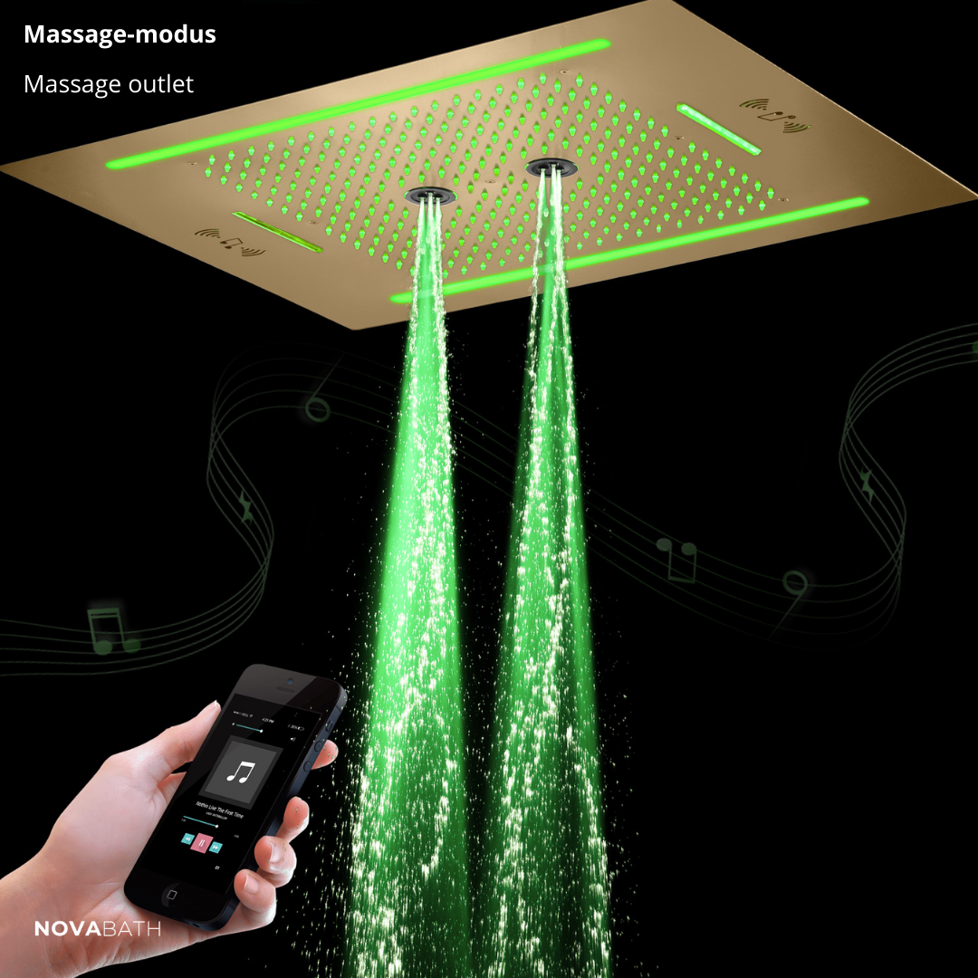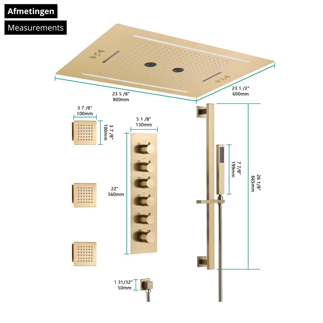 5-in-1 Thermostatische Inbouw Regendoucheset Valerie – Bluetooth & Speakers – LED Verlichting – Massagejets - Brushed gold