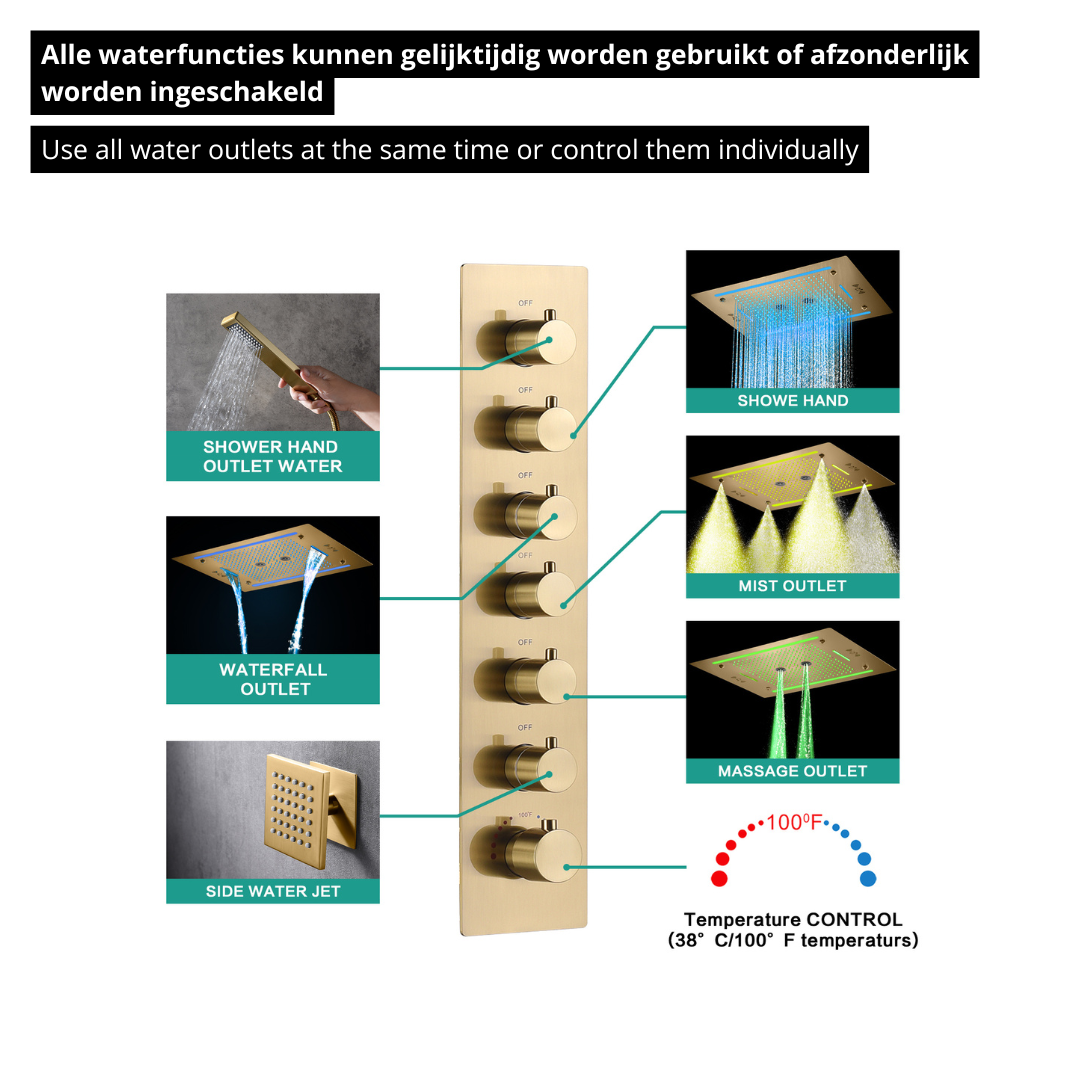 6-in-1 Thermostatische Inbouw Regendoucheset Marino – Bluetooth & Speakers – LED Verlichting – Massagejets - Brushed gold