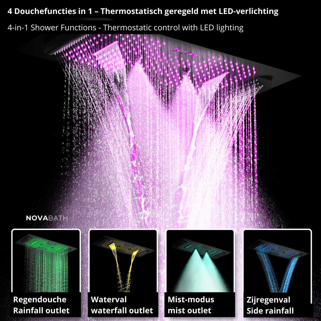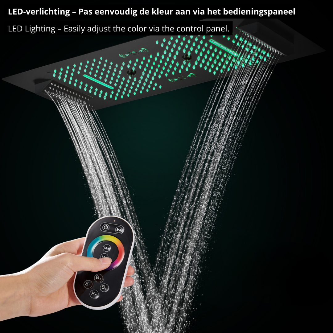 6-in-1 Thermostatische Inbouw Regendoucheset Sylvia – Bluetooth & Speakers – LED Verlichting – Massagejets - Zwart