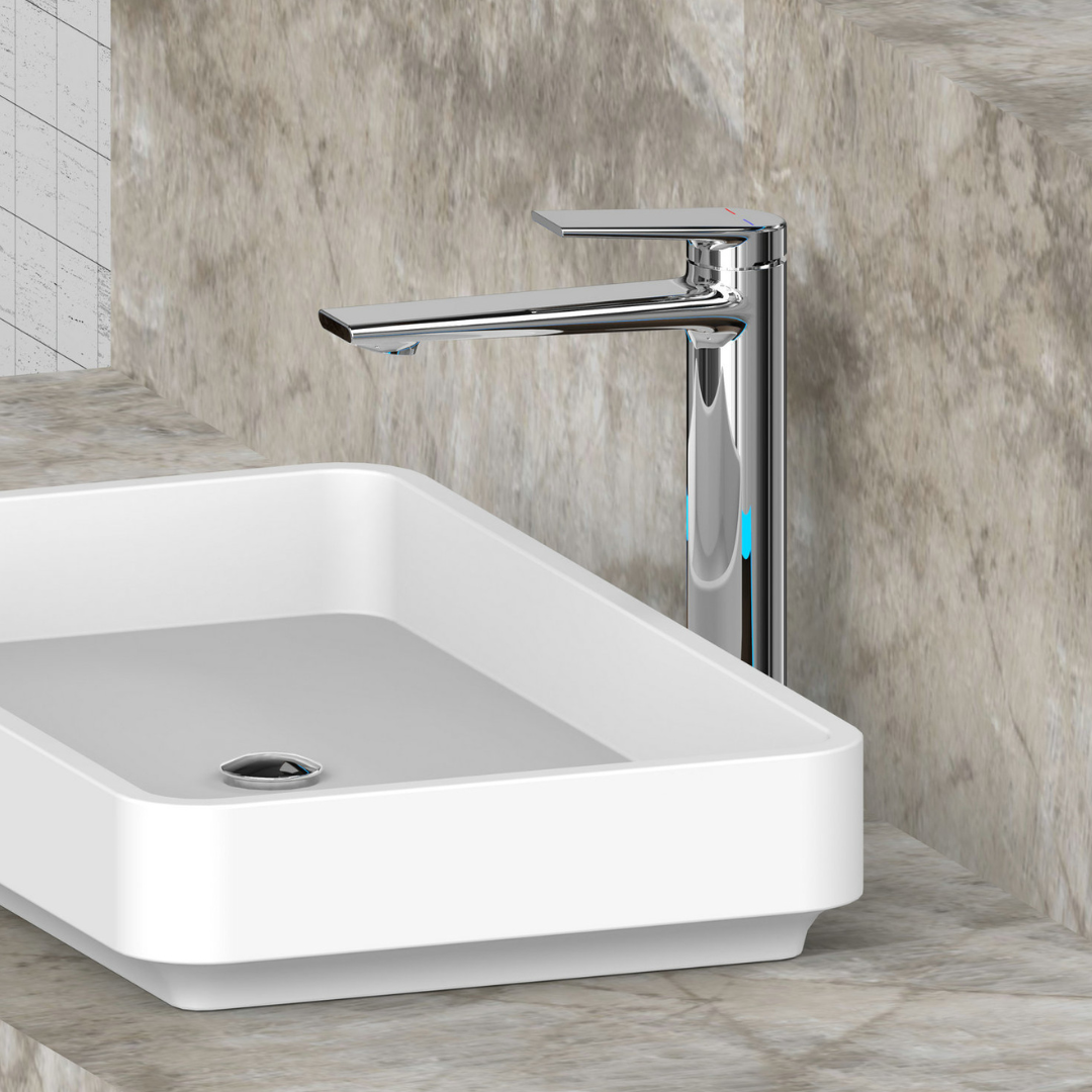 De hoge wastafelkraan van NovaBath combineert verfijnd design met uitzonderlijk gebruiksgemak. Door zijn elegante hoogte en hoogwaardige afwerking voegt deze kraan een stijlvol accent toe aan je wastafel, zonder concessies te doen aan functionaliteit.