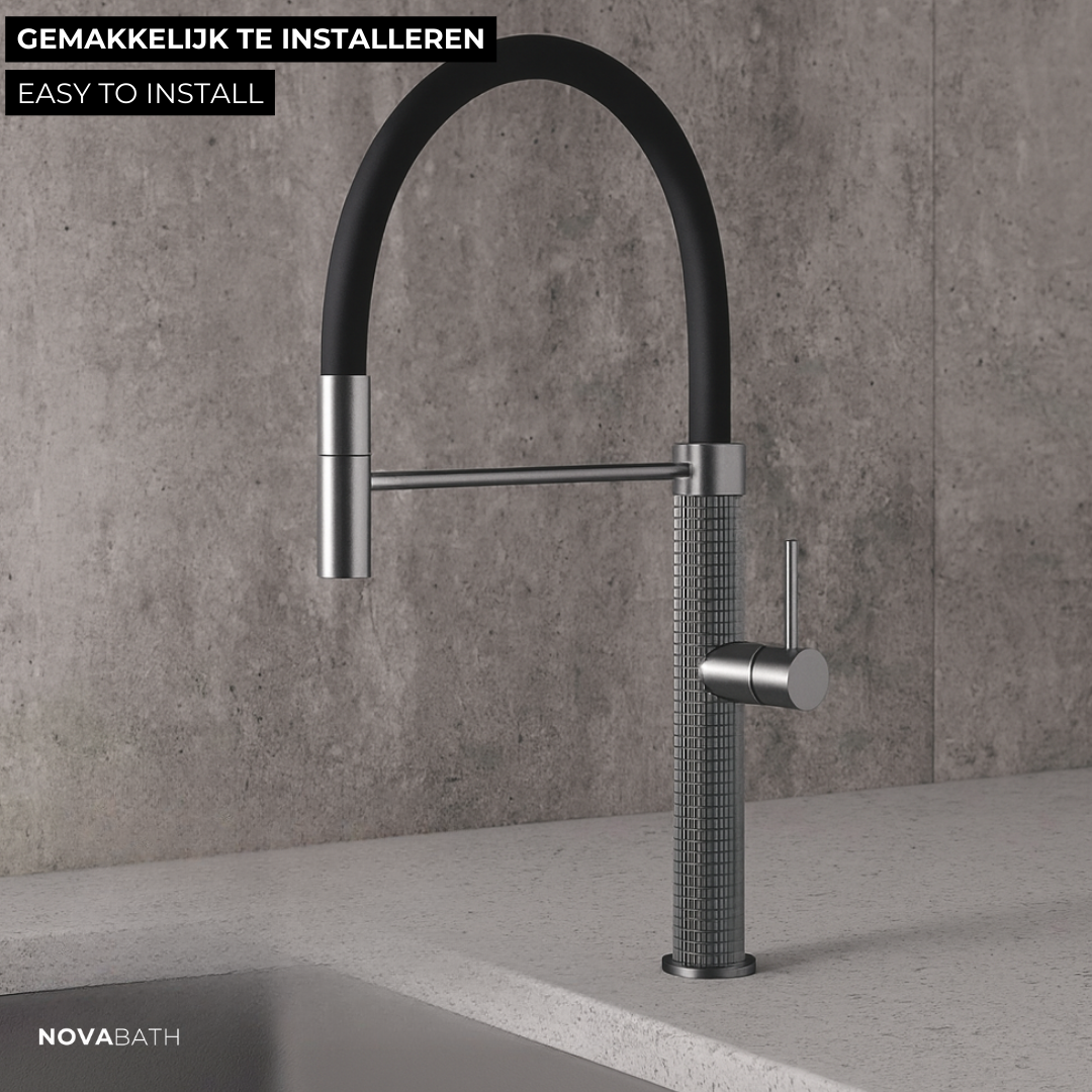 De keukenkraan van NovaBath combineert een strak, modern ontwerp met ongeëvenaard gebruiksgemak. Dankzij de elegante vormgeving en duurzame afwerking voegt deze kraan een luxe uitstraling toe aan je keuken, terwijl hij tegelijkertijd functioneel en praktisch blijft.